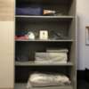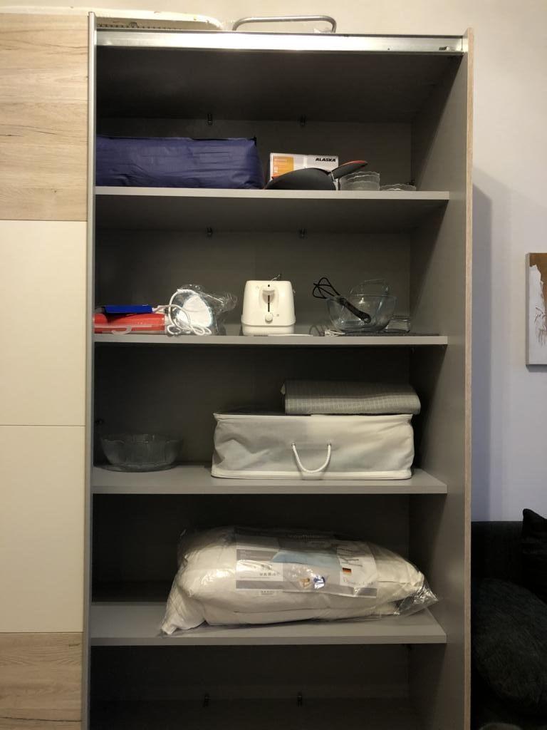 • le côté chambre est équipé d’une grande armoire à vêtements (1 couette, 2 oreillers, 2 parures complètes de draps de lit, taies d’oreillers et housses de couette) ;