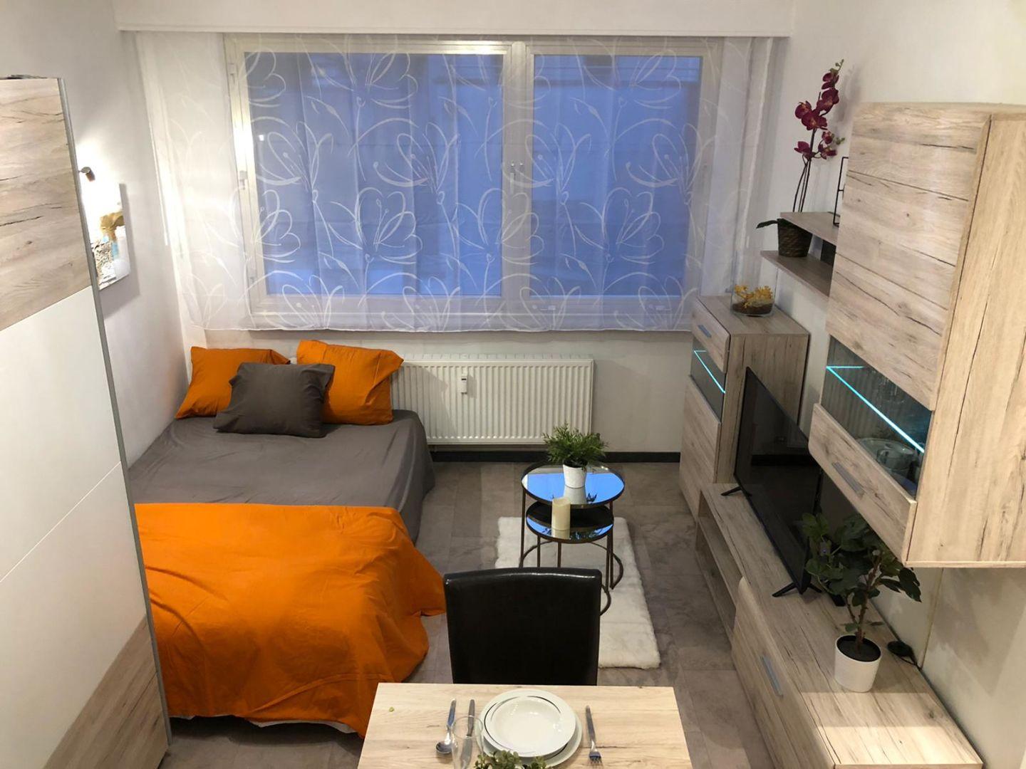 • le côté séjour/chambre est équipé d’armoires de rangement, canapé/lit à 3 places (140/200 cm), petite tables de salon, table et fer à repasser, aspirateur et télévision ;